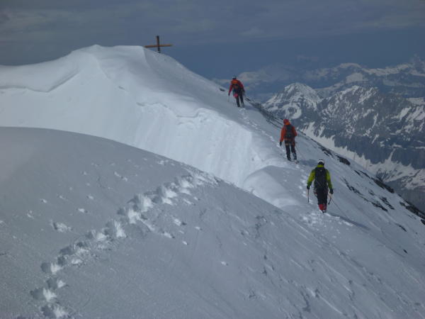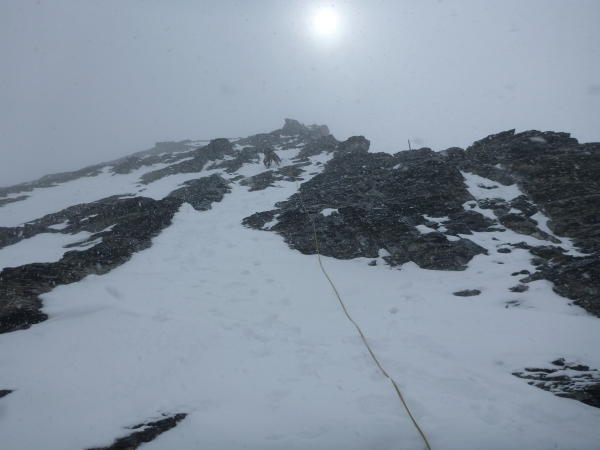 Der Abstieg über den NW-Grat recht gut in Fels und Schnee. Genügend Sicherungsmöglichkeiten an den Eisenstangen.
