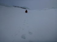 Der Hüttenzustieg ist im oberen Teil recht mühsam mit tiefem, nassem Stampfschnee. Der Zustieg zur Wand ist etwas besser aber ohne Spur selbst am Morgen noch recht tief.