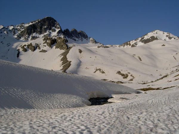 Unten noch genügend (fauler) Schnee, am Schwarzhorn Südgrat und am Radönt N-Grat je eine Stelle, wo die Skis kurz getragen werden müssen. Der Schnee war erst ab ca. 2700m gefroren, die Abfahrt dementsprechend faul.
