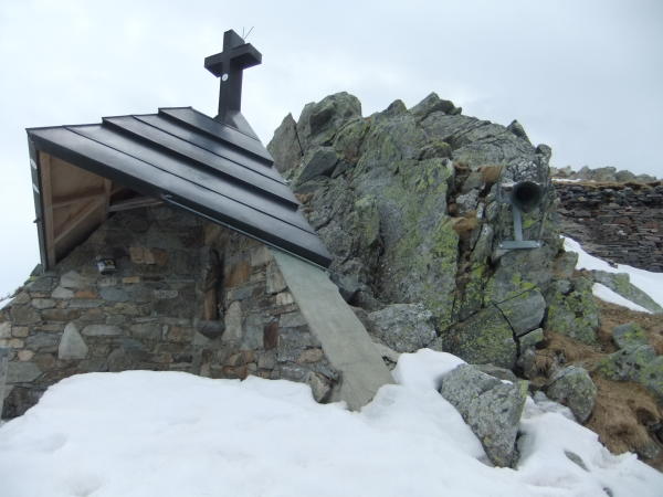Nach 40 Minuten über den Südgrat wurde exakt um 12:00 mittags der Pizzo Camoghè (2228 m) erreicht, 3,5 Stunden ab Monte Bar. Mit der Mini-Kapelle und Gipfelglocke am Felsblock rechts daneben. Von diesem ausgezeichneten Aussichtsberg genießt man Rundblick ins Tessin, Val Calanca und Graubündner Berge, sowie zu den Walliser Viertausendern.