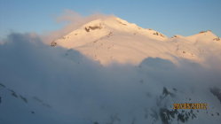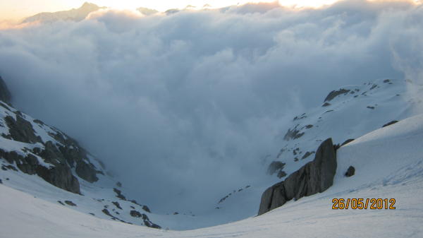 Beim Abmarsch kurz nach 5 Uhr (im Nebel) war klar: Durchgefroren wäre anders! Trotzdem gute Verhältnisse zum Aufsteigen; die Lawinenkegel unterhalb der Valletta-Lücke können gut links umgangen werden. Nach der Abfahrt kann die Aufstiegsroute frei gewählt werden, Schnee griffig. Vom Skidepot zum Gipfel Trittschnee, geht ohne Steigeisen und Pickel.