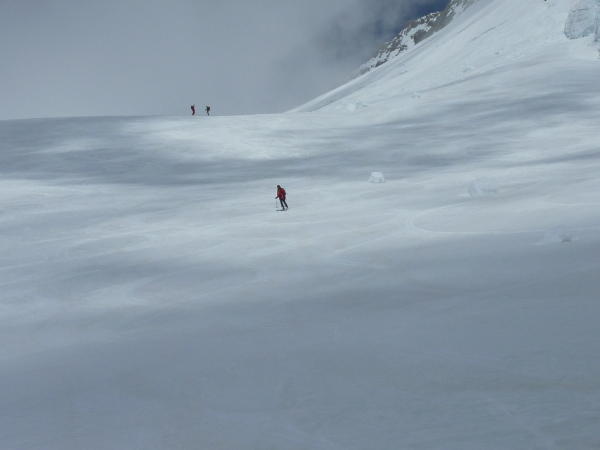 Gipfel in dichtem Nebel. Abfahrt vom Louwitor perfekter Sulz. Aufbruch in der Hollandiahütte am 07.00 Uhr. Schnee sehr gut tragend. Äbeni Fluh im Nebel. Aus diesem Grund nur bis zum Anujoch mit viel Sonne. Abfahrt wieder toller Sulz. 10.30 Uhr Von der Hütte über den Langgletscher noch etwas hart. Noch viel Schnee. Doch zeichnen sich langsam die ersten Spalten ab. Im unterstein Teil 2-3 mal kurzes Skitragen. Konnten noch weit runter fahren. Ski mussten ca. 20 Min. bis Fafleralp getragen werden.