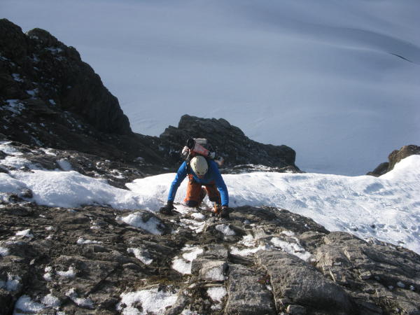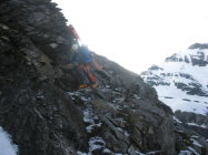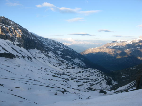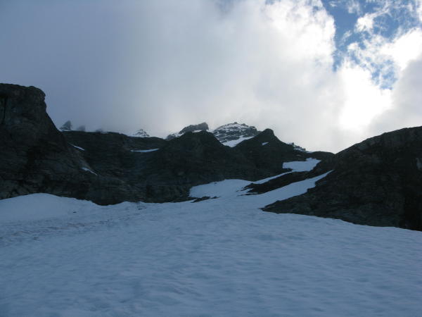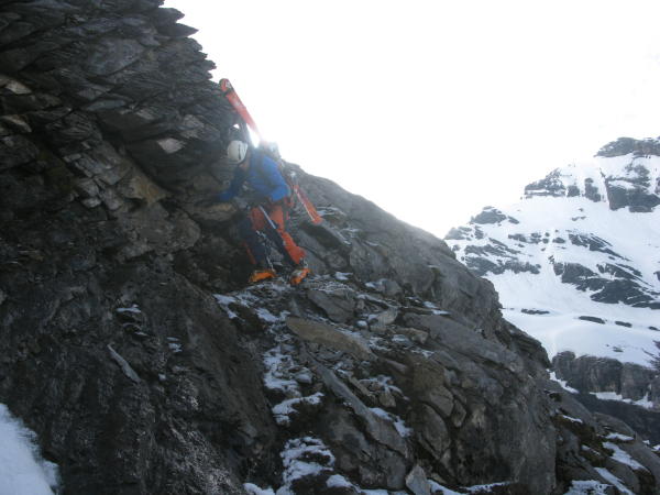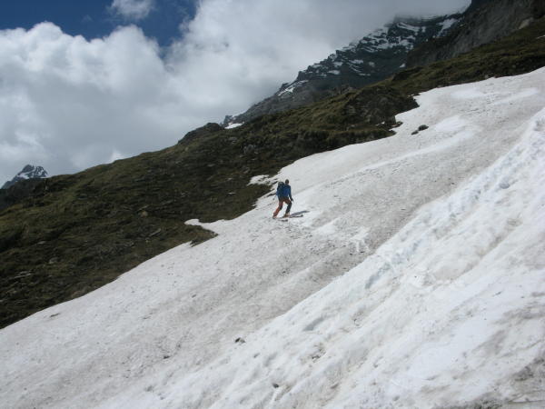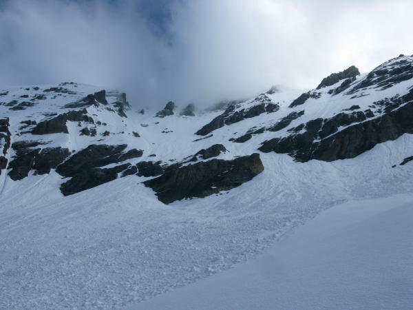 ski bis auf höhe lötschegletscher getragen,meist weg benutzt, es müssen aber einige steile schneefelder gequert werden.lötschegletscher,gizzifurgge und dalagletscher gute schneeverhältnisse. südwand dünner deckel, darunter bodenloser nassschnee, daher umgekehrt, abstrahlung und temperatur konnten die schneeverhältnisse nicht brauchbar machen....beim ersteigen der rampe felskontakt,aber noch machbar, von der schneemenge her wäre die tour nicht schlecht. sonne ab ca. 08.00 uhr in der wand. richtung leukerbad noch recht weit runter fahrbar, richtung gastere mit hilfe der schneefelder/skitragen bis schönbühl 2042m möglich.um 11 uhr ist der schnee schon weit oben tüchtig aufgeweicht.