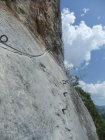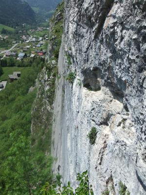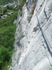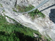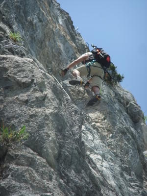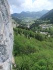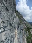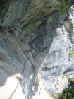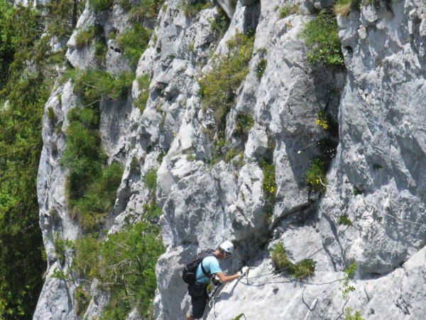 Typisch französischer Sportklettersteig bestehend aus hauptsächlichen Querungen zur rechten Seite hin maximal ausgesetzt mit wenig Felskontakt, knackig, aber mit vorbildlicher Sicherung von unten bis oben. Dazwischen kraftraubende Wandstufen mit dem Überhang als Finale vor dem Ausstieg. Dort traf ich dann Thierry aus dem Elsass, der während der Tour mit gleicher Geschwindigkeit vor mir durchstieg.