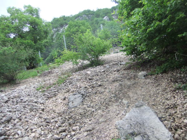 Bereits am frühen morgen hört man in kurzen Abständen ständiges Poltern und Schlagen herabfallender Steinchen oder größerer Teile beim Zustieg. Allgemeine Gefährdung, getroffen zu werden, war wohl zu groß. Darum wurde die Ferrata am steilen Zahn über dem lieblichen See offensichtlich geschliffen.