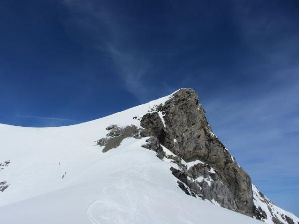 Mit Sonne wird der Gipfelhang schon sehr schnell, sehr feucht. Gegen 9 war der Gipfelhang schon aufgefirnt.