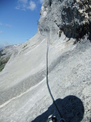 Aufstieg wie in einem Sportklettersteig. Teilweise waren aber noch größere Schneefelder im Abstieg über die Nordseite zu traversieren. Gute Bergschuhe und Stöcke sind dabei hilfreich.