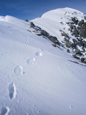 Noch viel Schnee in der Gegend. Mindestens Schneeschuhe, wenn nicht gar ein Paar Ski (aber nur die Alten...). Stellenweise mit Schneeschuhen knietief eingebrochen... (morgens zwischen 6 und 7). Pickel und evtl. Steigeisen (Gipfelgrat). Fast geschlossene Schneedecke ab ca. 2200m.