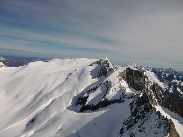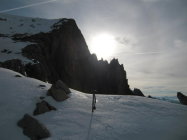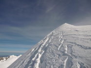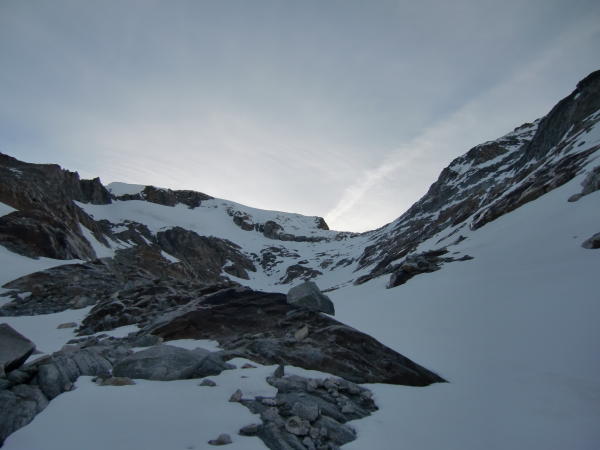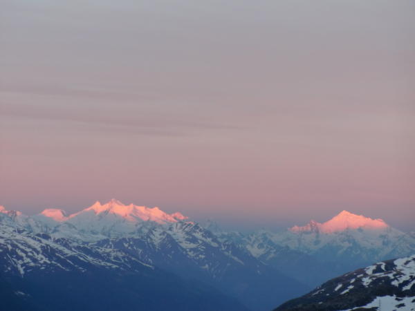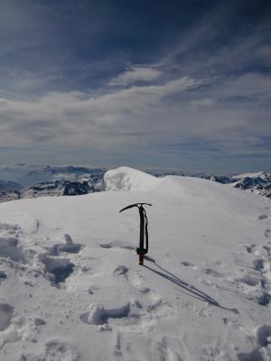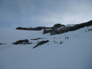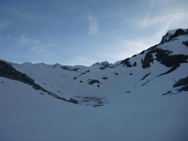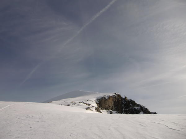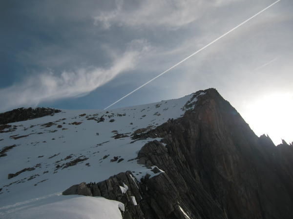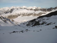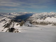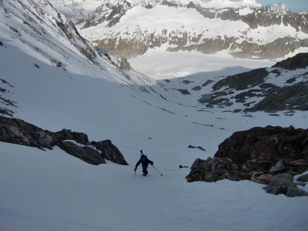 Rohnegletscher noch gut eingeschneit, einige wenige Staellen über Eis. Mit Ski bis auf Gipfel möglich, in der Gipfelflanke pulver, Rest beim Aufstieg Pickelhart, beim Abfahren unten raus schöner Sulz.