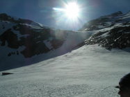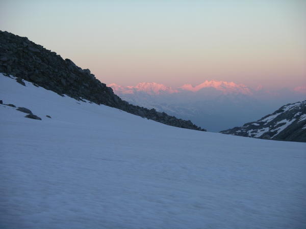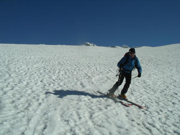 Start kurz vor 5 Uhr (+5 Grad, super) beim Belvédère. Rhonegletscher erstaunlich gut "eingeschneit", einige eisige Stellen, die kein Problem darstellen. Nach der Abzweigung griffiger Schnee, so dass fast bis zum Galensattel ohne Harscheisen gegangen werden kann. Kurze Tragpassage, dann bis zum Skidepot (falls man ohne Skis zum Gipfel geht) wieder gut, vor allem mit montierten Harscheisen.