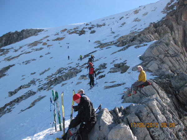 Die Ski auf den Gipfel zu tragen wie der Schreibende, lohnt sich nicht. Die Rutschpartie zum Skidepot bietet wenig Abfahrtslust.