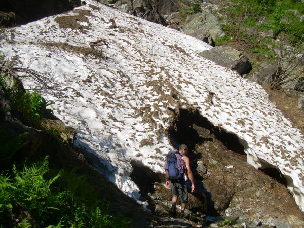 In den Hüttenzustiegen liegen auch noch ein paar Schneefelder, welche sich aber unproblematisch überwinden lassen. Den Staubenbach überquert man derzeit über ein gut tragendes, dickes Lawinenschneefeld, die Brücke liegt montagebereit am Weg. Ein Einbrechen durch die Schneebrücke wäre allerdings fatal und mit Sicherheit tödlich. Wer Zweifel hat, kann auch über den Geißweg zur Hütte gelangen, welcher allerdings landschaftlich weitaus weniger attraktiv ist.
