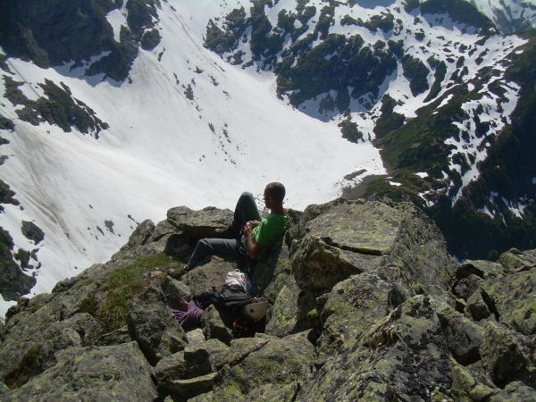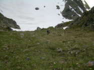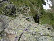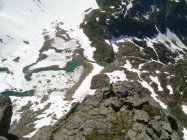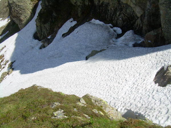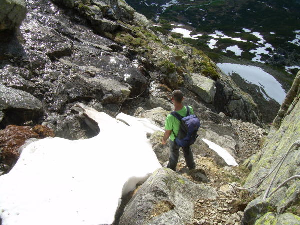 Der Fußabstieg geht problemlos, eine mit Fixseil gesicherte Stelle, an dersich noch eine kleine Schneezunge befindet, lässt sich mit etwas Geschick gut meistern. Ich geben dem Schnee dort sowieso höchstens noch eine Woche.