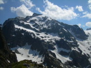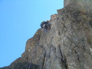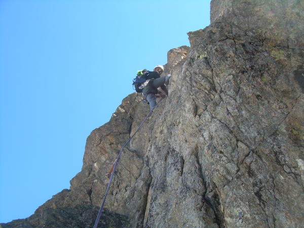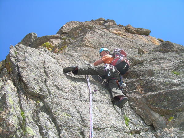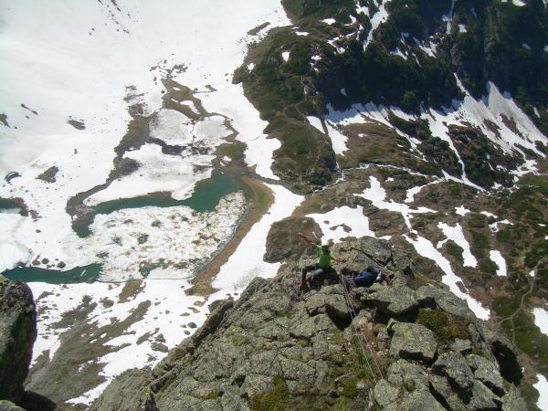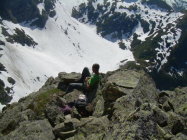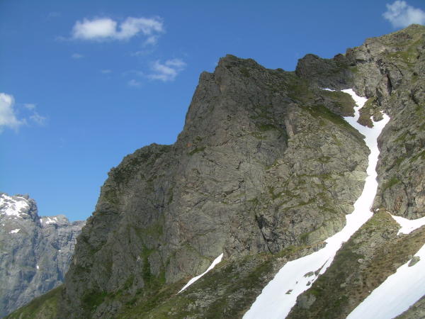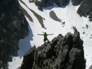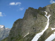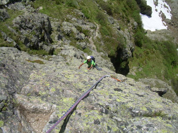 Im Zustieg liegen noch größere Schneefelder. Das obere, kurz vor dem Einstieg zur Route, ist recht steil. Wir kamen im angeweichten Schnee ohne Pickel zurecht, die Mitnahme eines solchen ist aber sicher nicht verkehrt. Sollte nach einer kalten Strahlungsnacht der Schnee gefroren sein, dann eben entweder später aufbrechen, wenn die Wärme schon auf den Schnee eingewirkt hat, oder die Steigeisen mitnehmen. Mit kalten Fingern klettert es sich ohnehin nicht gut ;-).