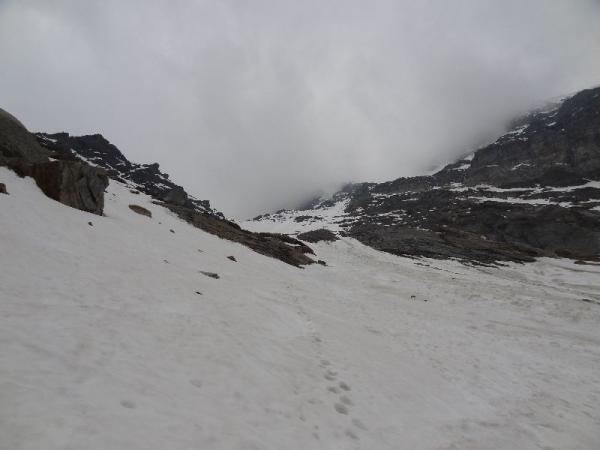 Die Spuren der Vorgänger waren am Dienstag morgen nur noch ganz im obersten Teil schwach ersichtlich. Ansonsten hatten die Lawinen und ein Gewitter am Montagabend alle Spuren vewischt.