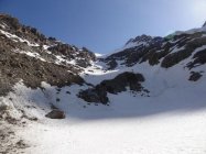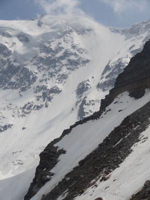 Im Laufe des Nachmittags dann in der Wand und darum herum teils grössere Lawinenabgänge. Eine Skibefahrung der Wand scheint nun aufgrund vieler Runsen und Rinnen kaum mehr möglich (oder zumindest sicher nicht mehr lohnend). Einige Lawinenabgänge haben auf gewissen Streifen die gesamte Schneebedeckung der Wand ausgeräumt, und es kommt Blankeis zum Vorschein (kann jedoch problemlos umgangen werden).