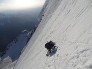 Im untersten Teil war die Wand nur knapp gefroren. Immer wieder mal bricht man bis zu den Knien ein. Im Mittleren Bereich (bei der Felsinsel) dann gut gefroren und hart. Oben raus ist es wieder etwas tiefer, jedoch relativ guter Trittschnee. Im Ausstieg ist die Wand auf wenigen Metern fast blank, geht jedoch trotzdem gut.
