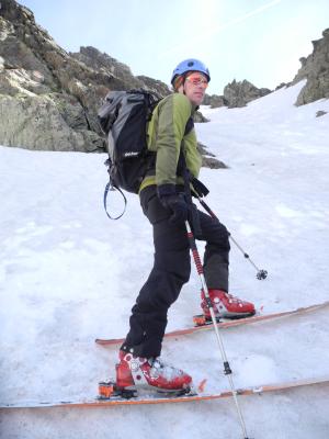 Seit Tour vor einer Woche nur noch halb so viel Schnee:desshalb nicht wie vorgesehen alle Coulivariante an Südseite abgrasen,sondern nur noch das verbleibende Rechte.Erstaunlicherweise sehr gut abgestrahlt und gefrohren ganze Route.Steilteil hart griffig zu fahren,unten angesulzte Regenrillen auch nicht schlecht.ohne Tragen bis PW.