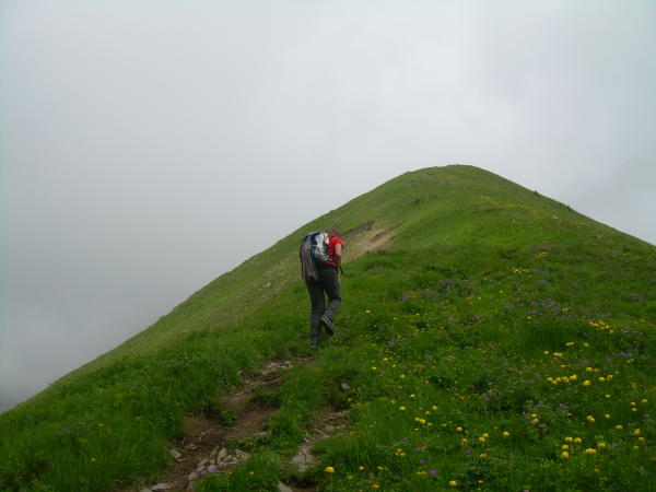 Aussicht etwas diesig und zum Schluss neblig. Ansonsten gute Wandrvehältnisse, es hat nur noch ein paar harmlose, bereits gespurte Schneefelder.