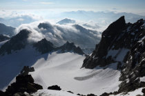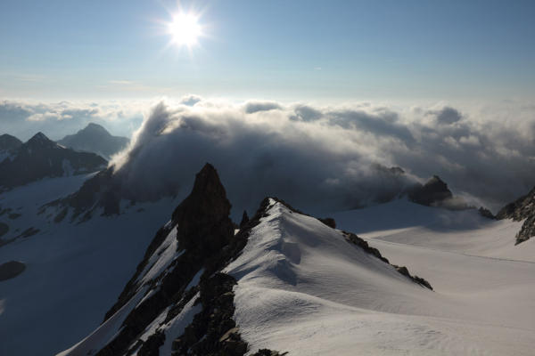 Ideal, noch viel Schnee ab 2800m aber gefestigt. Inzwischen gespurt. Gipfelaufbau ebenfalls viel Schnee in den Rinnen, ideal trittfest. Spalten am Gletscher noch zu. Fels gegen den Grat zu fester. Schnee nur am Morgen gut, ab 8:00h aufsulzen auch am Gletscher. Kein Blankeis.