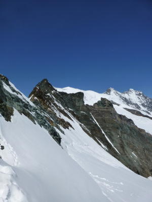 Perfektes Wetter. Trotz spätem Spart (erster Kurs der Felskinnbahn 8.30 Uhr) beim Allalinhorn (Auf- und Abstieg) gut gefrorener und gut zu begehender Firn. Schöne leichte Kletterei in den trockenen Felsen des ESE-Grat des Feechopfs. Beim Abstieg zur Täschhütte machte sich dann der späte Aufbruch bemerkbar: Tiefer, z.T. grundloser aufgeweichter Schnee machte den Abstieg zur harten Arbeit!