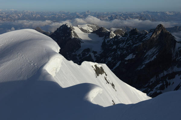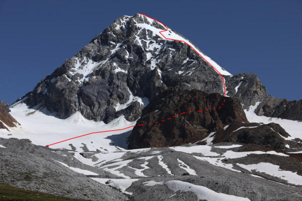 Ganz wichtig: wirklich früher Aufbruch, die ostseitige Lage bewirkt schnell weichen Schnee. Die Route ist klar und man sieht unten auch Nachts die nötige Richtung. War um 6:15h auf dem Gipfel, da hat man genügend Reserve für den Abstieg. Dies ist entscheidend, der Berg ist gefahrenträchtig wie der tödliche Unfall vom Montag zeigt.