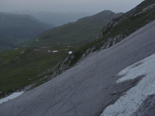 Bin am Abend zum Beginn des Geröllkegels aufgestiegen, und hab dort freibiwakiert, von 1.30 bis 5.00. Wegen des aufkommenden Windes etwas ungemütlich, im Sommerschlafsack ohne Biwaksack, da wehte es etwas durch.