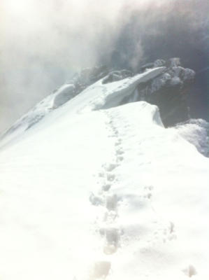 Zur Zeit hat es noch viel Schnee auf dem Firngrat ab ca. 3400, Spurarbeit mit 30cm einsinken war angesagt. Da sich der Neuschnee der letzten Tage nicht mit dem Felsen verbunden hat, gibt es z.T recht heikle Positionen. Wir haben an zwei Stellen Eisschrauben gesetzt. Abstieg via Zackengrad problemlos.
