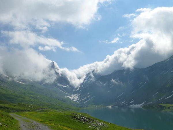Der Glattalpsee ist randvoll,darum ist es ratsam die östliche Seeseite zu wählen.