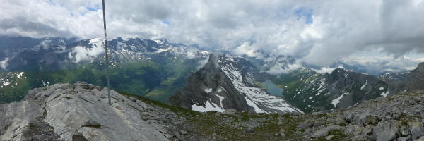 Am Morgen nach dem Regen vom Restaurant Glattalp nach dem Kaffeehalt um 10.30 Uhr gestartet. Das Wetter wurde immer besser bis zu herrlichem Sonnenschein war alles zu haben. Den Abstieg(Rutschbahn)über die Schneefelder ist zur Zeit genial,im nu waren wir wieder am ende des Glattalpsee. Wir waren die einzigen die den Ortstock machten. Zur Furggele stiegen noch zwei Weitere von der Braunwaldseite über die steilen Schneefelder.