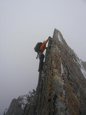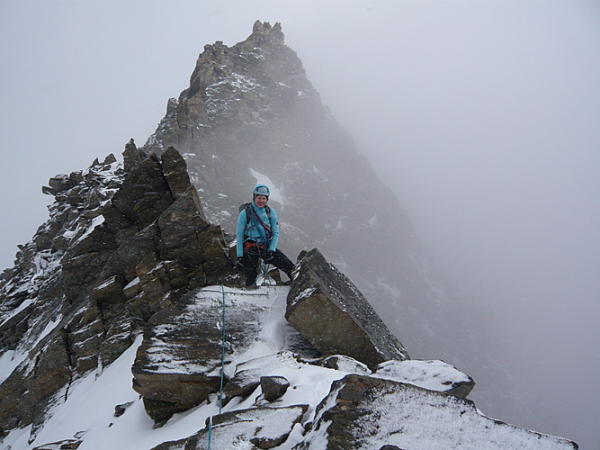 Start Punkt 4 Uhr vom vollen Hohsaas (länger hätten wirs es sowieso nicht mehr ausgehalten). Weg zum Lagginjoch gut, aber nur vereinzelte Spuren. Zuerst kamen wir recht gut voran auf dem Grat, jedoch ca um 7 Uhr einestzender Schneefall, ca 3 cm Schnee. Danach alles rutschig und nass. Oft muss man auf Reibung stehen, viel Spass mit den steigeisenfesten Schuhen! Es hat auch noch recht viel alter Schnee welcher aber bald aufweicht und nicht mehr gut hält. Wir sind dann nur langsam vorwärts gekommen, teilweise simultan geklettert, teilweise Standplatz. Der Grat ist sehr lang und wollte einfach nicht aufhören. Gegen Ende wurde das Wetter besser und der Fels trocknete teilweise. Firngrat mit ca 10 cm lockerem Neuschnee, kein Blankeis.