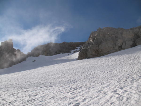 Schnee wird mit den kommenden warmen Sommertagen rasch wegschmelzen und der Gletscher zunehmend aperer. Der Übergang Hohsandjoch entspreechend schwieriger, wie auch der Steilaufschwung auf ca. 3000m, dort wo sich dann auch der Schrund zunehmend zeigen wird.