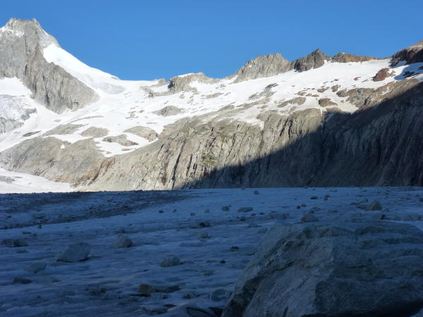 Perfekte Verhältnisse. Wunderschönes Wetter. Da der Beichgletscher weitgehend blank ist, musste nur für eine kurze Strecke vor P. 2752 angeseilt werden. Die Nordseite des Beichpasses ist oberhalb des Dischliggletschers schnee- und eisfrei und entsprechend problemlos zu begehen.
