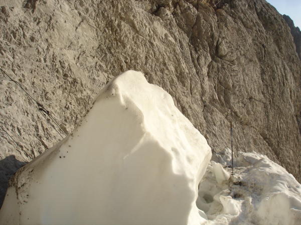 Übergang zum Fels: zur Eisenleiter nicht möglich, oberen Zugang nehmen, da liegt ein großer Schneeblock in der Randkluft.