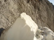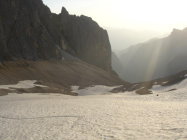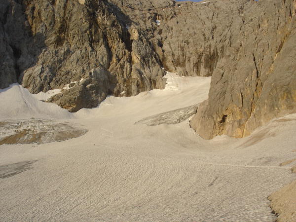 Höllentalgletscher guter Trittfirn, morgens um 7 nicht hart, noch keine Steigeisen nötig.