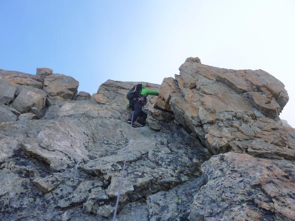 Durch den Gewitterregen vom Dienstag sind die Felsen nach der Rampe mit Wassereis überzogen gewesen. Alles mit Steigeisen geklettert. Der Start am 02.00 Uhr noch sehr dunkel. Den Helm beim Gletscher als Markierung weg vom Gletscher schwer zu finden. Der Bergschrund ging gerade so. In der Rampe ist der Schnee am Morgen schon recht weich gewesen. Aus diesem Grund auf die linken Felsen ausgewichen. Ab Rampe starker Wind und frisch. Leider alles im Nebel. So gut wie keine Sicht auf dem Gipfel.