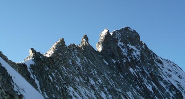 Sehr gute Verhätnisse... bis zur Epaule guter, geforener Firn, ab Epaule kann der grösste Teil des Felsgrates ohne Steigeisen begangen werden, jedoch sind gewisse Stellen angenehmer mit Steigeisen, so haben wir 2-3 mal die Eisen an/abgezogen.