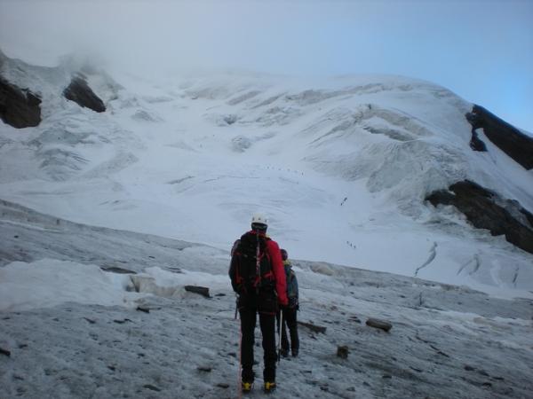 Im Aufstieg bester Firm, sehr gute Spur. Die ersten Gletscherspalten öffnen sich direkt nach dem Anseilplatz und weiter oben gibt der Triftgletscher immer wieder mal eine Spalte frei. Vorallem der Bergschrund nach knapp 1/3 wird mühsamer werden.