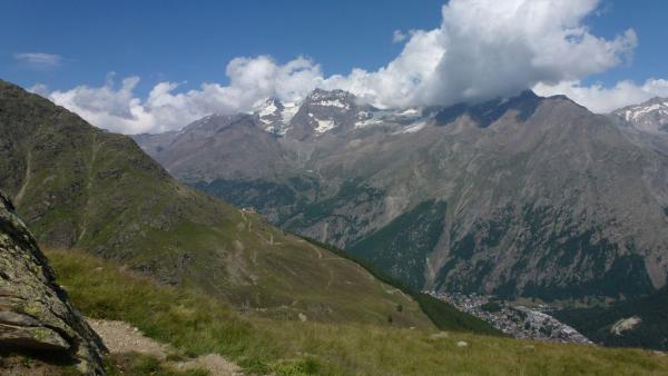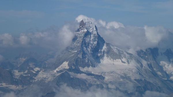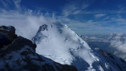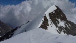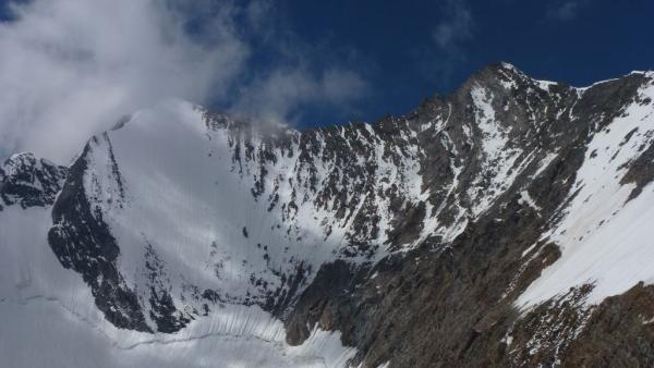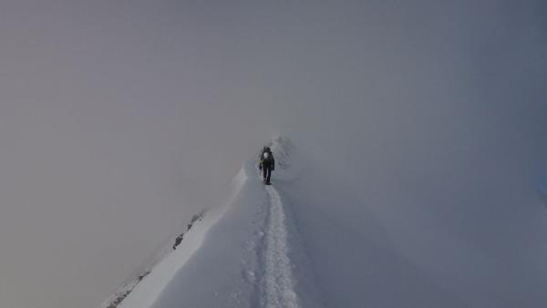 Am Vortag hat es am späteren Abend noch leicht geregnet und ein Blick vor die Hütte zu früher Morgenstund zeigte teilweise dichten Nebel, jedoch keinen Regen. Tom sagte, dass sich der Nebel lichten wird und es ein ganz passabler Tourentag wird. Er sollte zum Glück recht behalten. Die Temperaturen ab der Hütte waren angenehm und es herrschte kaum Wind. Am Windjoch kündigte sich mit der wunderbaren Dämmerung ein herrlicher Tag an. Gemächlichen Schrittes stiegen wird dem Gipfel entgegen, der anfänglich kaum näherrücken wollte. Zwischendurch verdeckten Nebelschleier diesen. Oben wurde es etwas windiger und merklich kühler. Am Gipfel selbst hatten wir eine herrliche Aussicht auf die umliegenden Berge wie Dom, Matterhorn und wie sie alle die berühmten 4.000er heißen. Quellwolken verhüllten den einen oder anderen auch immer wieder. Es waren wenige Leute unterwegs und so konnten wir unserer Gipfelglück reichlich auskosten, bevor wird den weiten Abstieg zur Hütte und dann noch bis zum Hannig in Angriff nahmen. Gegen mittag wurde ab dem Windjoch der Schnee weicher und damit tiefer, aber wir konnten noch leicht gehen. Den ganzen Tag begleitete uns das Wechselspiel von Sonne, Quellwolken und Nebel, was der grandiosen Tour keinen Abbruch machte. Am Hannig spürten wir dann schon die vielen Höhenmeter in den Beinen und gerne setzten wir uns mit erleichterten Schultern in die Seilbahn und genossen nochmals in aller Ruhe die herrliche Rundsicht.