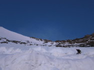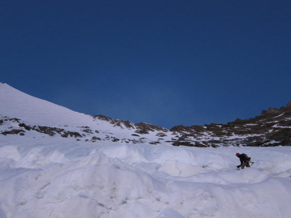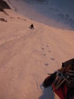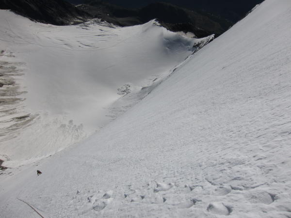 Weitere Wand guter Trittfirn, seilfrei bis 3 SL unterm Gipfel, dann Schraubenstände.