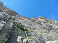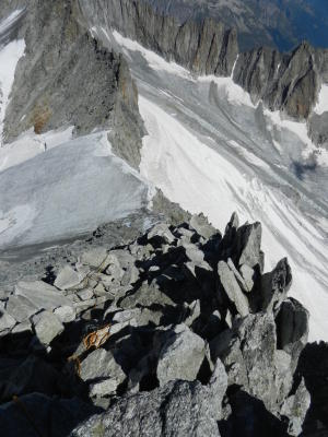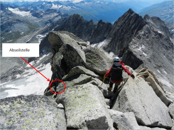 Tiefengletscher aper bis ca. 3000. Dort angeseilt. SE-Grat trocken und schneefrei und mit Bohrhaken zugebohrt (schade!). Stände ebenfalls gebohrt (Abseilen bis SL6 möglich ohne Materialverlust, danach wäre ein Rückzug abenteuerlich). Achtung: frischer Bergsturz kurz nach den schwierigen SL. Das Gelände ist dort immer noch in Bewegung. Gipfelgrat in weichem Trittschnee. Abseilpiste perfekt eingerichtet und einfach zu finden. Letzte Abseillänge könnte allerdings bald zu lang werden. Sidelengletscher oben noch tiptop eingeschneit, ab ca. 2800 aper.
