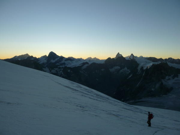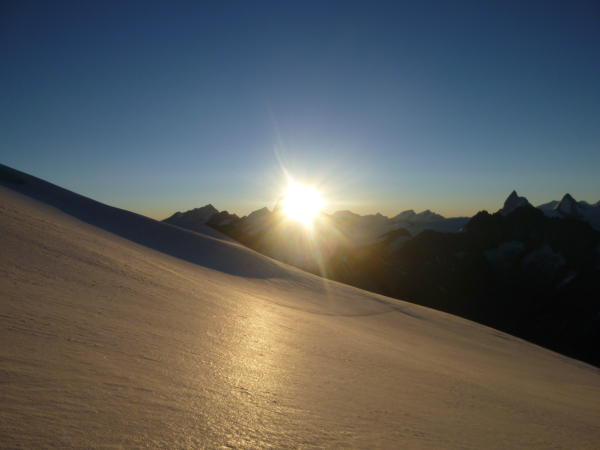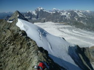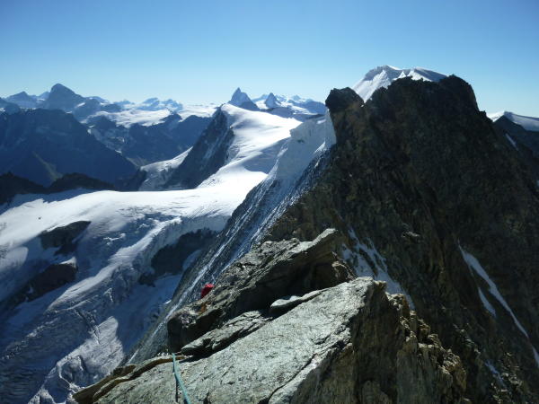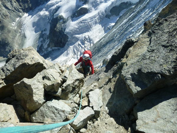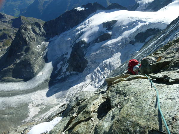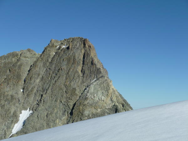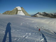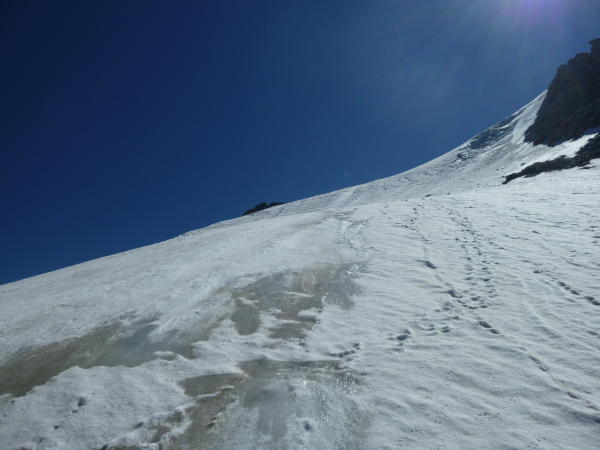 Im Anstieg zum Pkt. 3819 nach dem Col de la Serpetine muss ein Felsriegel, ca. 10 Meter überwunden werden. kein Problem. Die steilen Firnstellen in diesem Osthang können sehr gut begangen werden. Gute Spur. Achtung: Wechten!