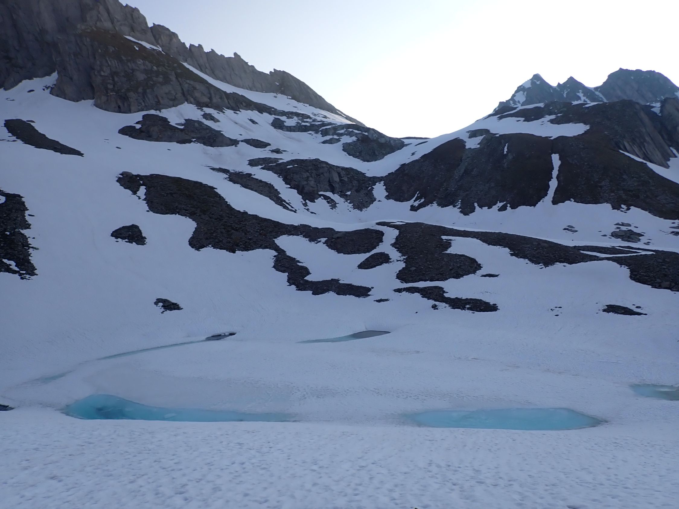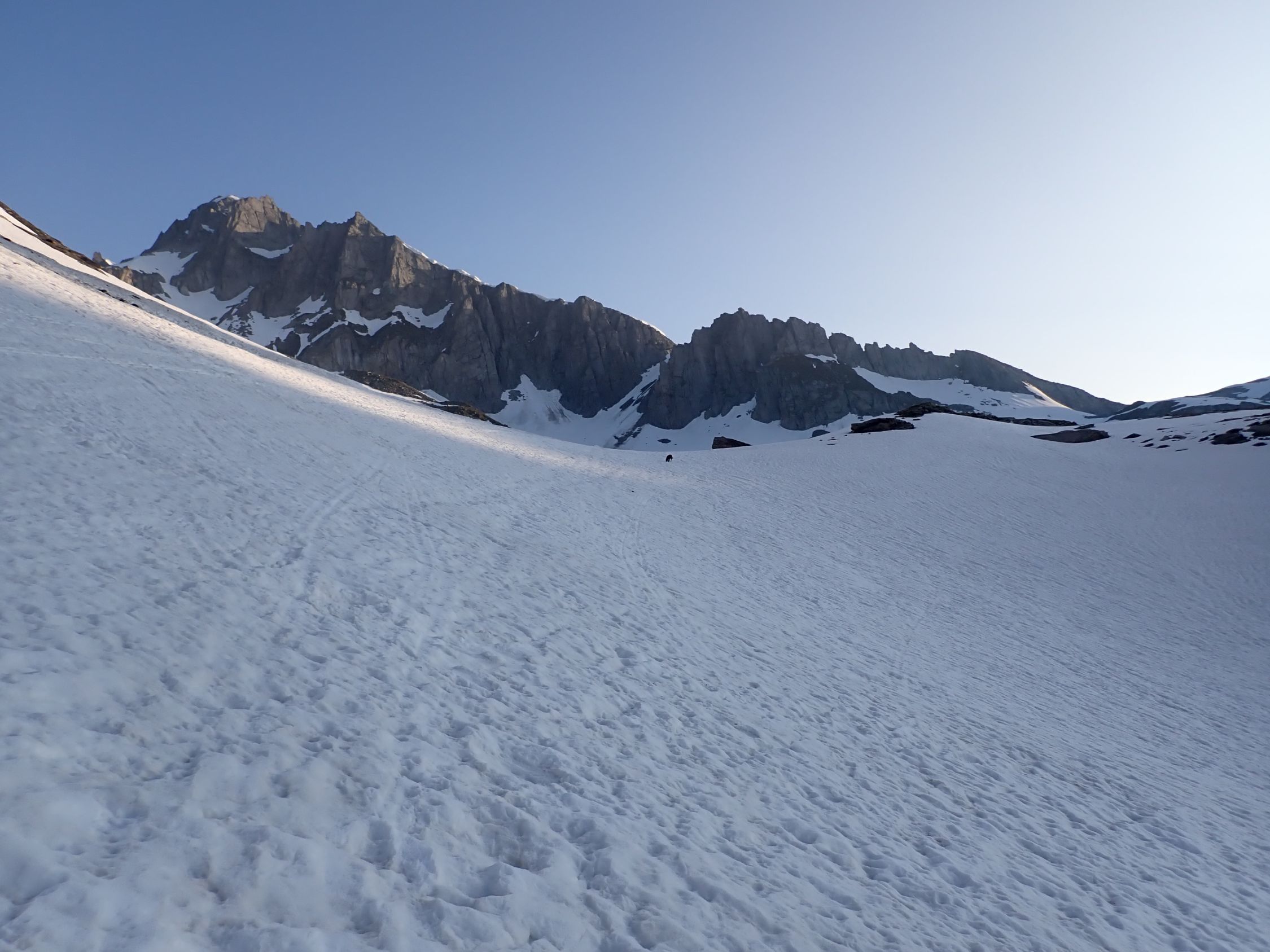 Start um 6.00 Uhr von Punkt 2410, mit Ski ab Strasse. Harter Schnee bis zur Gönerlilücke, wo wir unsere Skier gelassen haben. Dann mit Pickel und Steigeisen auf zwei Couloirs auf den Gipfel, mit schöner Kletterei.
