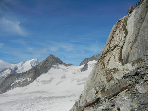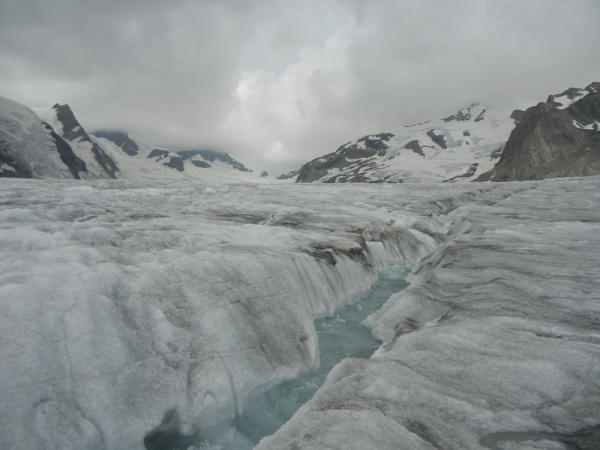 Rückweg: von der Finseraarhornhütte Absteig zum Fieschergletscher. Über diesen hinab bis zum Rotloch auf etwa 2700MüM, und weiter den Galmigletscher hinauf zum Studergletscher auf ca. 3000 MüM. Dann zum Oberaarjoch hinauf 3289 MüM. Kurzer Abstecher zum Oberaarjochhütte zu Kaffe und leckerem Linzerkuchen.