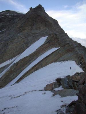 Nach einem relativ harschen Empfang auf der Täschhütte doch angenehme Bewirtung, sehr gutes und reichliches Essen, angenehme (und genug grosse) betten, modern eingerichtet (warmes fliessendes Wasser auf der Toilette!) der Frühstückskaffee ist nicht so der Hit, ansonsten OK. Routenfindung am Rotgrat nicht ganz einfach. Merci au Francais qui nous ont montré le chemain. Während die Massen sich auf der Normalroute hochschlängeln, ist man am Rotgrat fast alleine. Ein Gruss an die VS/DE-Seilschaft die uns begleitet hat!