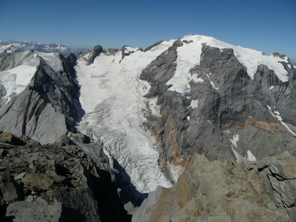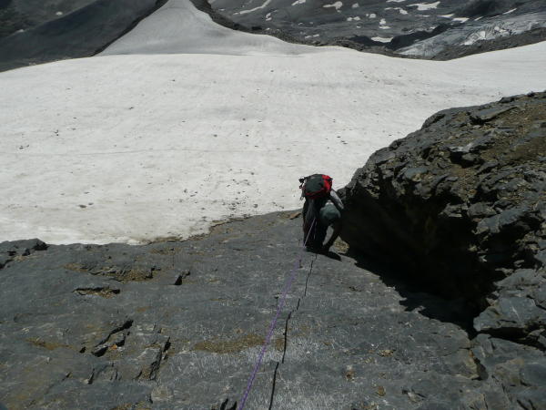 Bänderweg trocken, Schneefeld mit Steigeisen gut. Die Kletterstelle vom Schneefeld zum Grat ist mit mehreren Stahlstiften entschärft und gut sicherbar gemacht worden. Merci Hans Raunet!