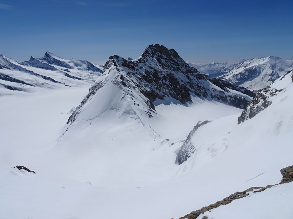Ich war diese Saison bereits am Mönch, ebenfalls mit Ski. Als ich bei dieser Gelegenheit von der Himmelsleiter in die knackige NE-Wand geblickt habe, war klar: Ich komme wieder! Der Aufstieg über den SW-Grat hat der Tour auch die nötige alpinistisch-technische Würze verliehen.