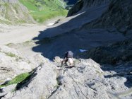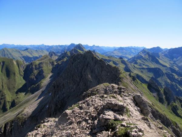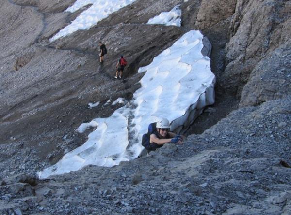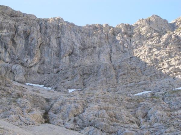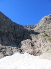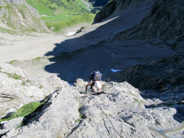 Prächtiger Sommertag. Bis zum Wasserfall am Talende sind wir im Schatten gelaufen. Im Gegensatz zu den letzten beiden Jahren hatte es unterhalb des Einstiegs in die Felszone ein Schneefeld, das in der Randkluft umgangen werden konnte. Ein kleines Schneefeld vor Beginn des Drahtseils war unschwierig unterhalb zu umgehen. Im Frühsommer dürfte dies eine heikle Stelle sein, wenn das Schneefeld noch größer ist. Fels im AV-Steig trocken. Traumhafte Fernsicht von der Zugspitze über Bernina bis zum Schreckhorn.