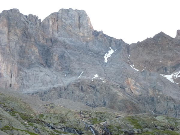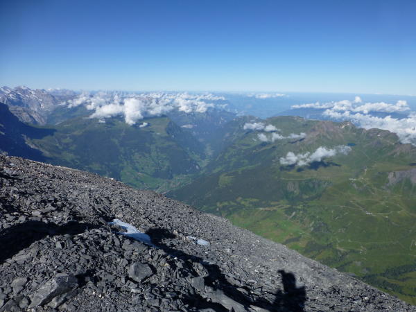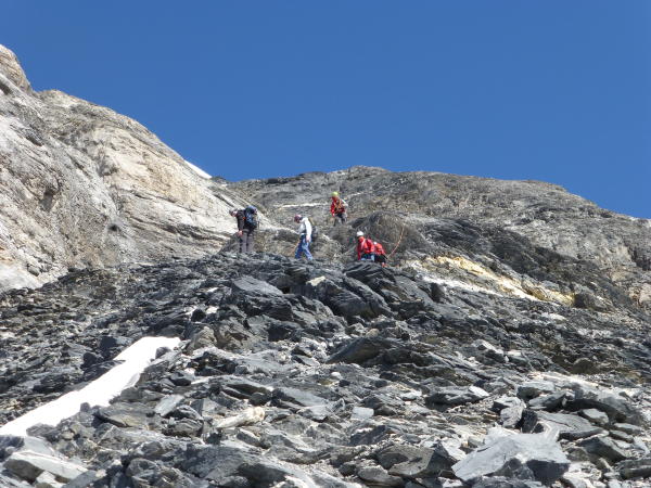 Chrinnengletscher teilweise blank. Gneis-Kalk-Sporn, Traverse, Willsgrätli und Gipfelaufschwung ganz schneefrei, sodass Steieisen nur auf dem Chrinnengletscher und bei der Passage beim Wettersattel nötig waren (Steigeisendepot beim Beginn des Gipfelaufschwungs).