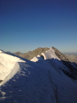 NW-Grat am Morgenhorn und Wyssi Frau sind Firnfrei. Sicherung mit Eisschrauben